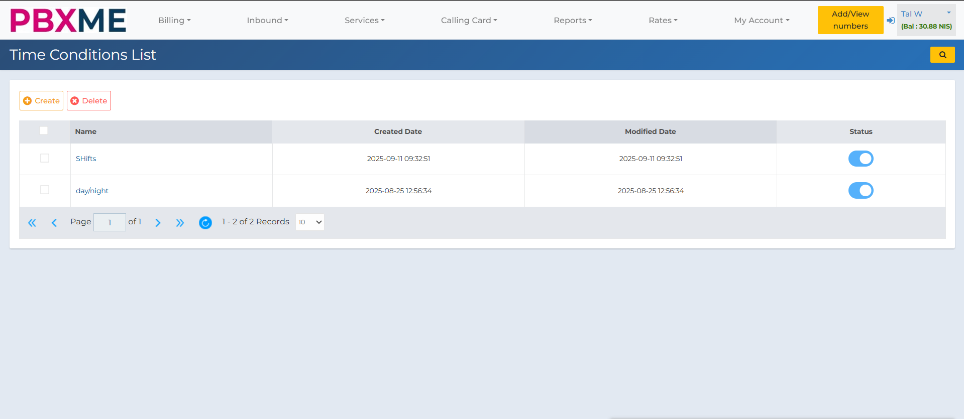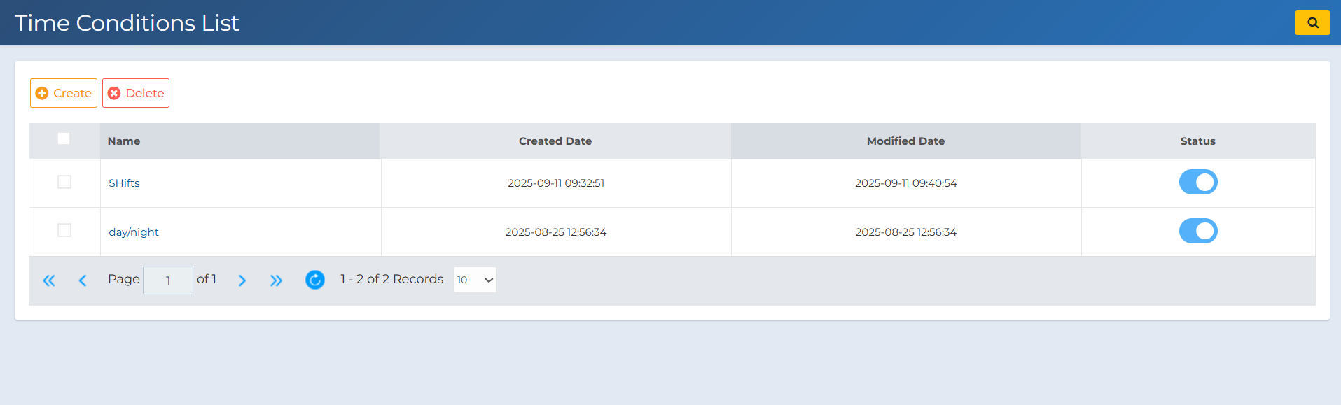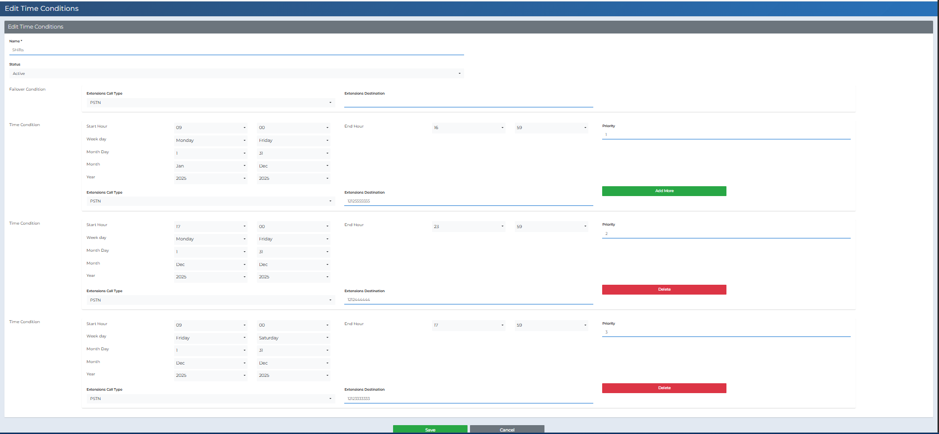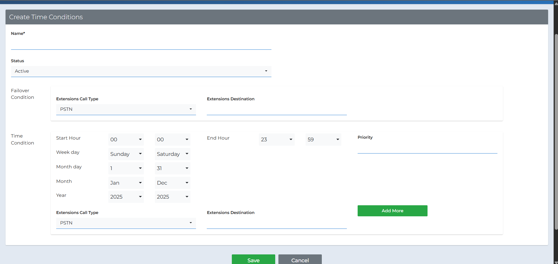 שלב 3: יצירת תנאי זמן חדשלחצו על Create והשלימו את השדות: Name – שם התנאי. Status – האם התנאי פעיל או לא פעיל. Failover Condition – היעד שאליו תנותב השיחה אם אין התאמה לאף כלל זמן. Start/End Hour – טווח השעות שבו הכלל חל. Week Day / Month Day / Month / Year – קביעת התקופה בה התנאי חל. Priority – סדר הבדיקה כאשר יש כמה תנאים (1 = הגבוה ביותר). Extensions Call Type – סוג היעד (למשל Queue, IVR, PSTN). Extensions Destination – היעד הספציפי שנבחר (איזה תור, איזה IVR או מספר). |